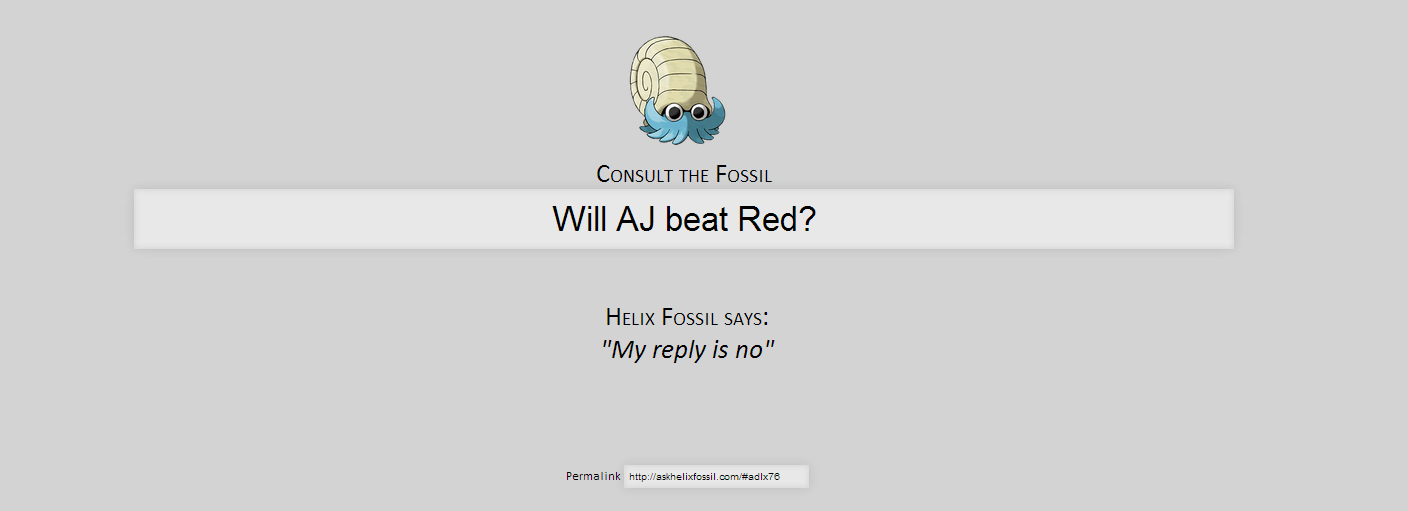 | Level: 49 Liberal Arts Major | PRAISE HELIX Gator beat Zapdos (weakened) and ATV. But Lord Helix entered the fight personally and cast down both Gator and Espeon to finish off AJ. PRAISE HIM --- xp1337: Don't you wish there was a spell-checker that told you when you a word out? |